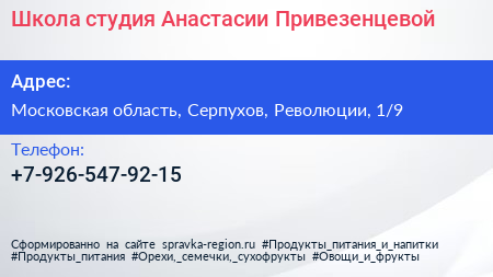 Школа-студия Анастасии Привезенцевой по адресу Московская область, Серпухов, Революции, 1/9 в дальнейшем Организация, размещена в следующих категориях: