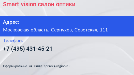Smart vision, салон оптики по адресу Московская область, Серпухов, Советская, 111 в дальнейшем Организация, размещена в следующих категориях: