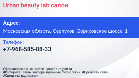 Urban beauty lab, салон по адресу Московская область, Серпухов, Борисовское шоссе, 1 в дальнейшем Организация, размещена в следующих категориях: