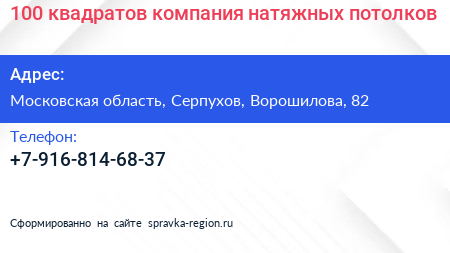 100 квадратов, компания натяжных потолков по адресу Московская область, Серпухов, Ворошилова, 82 в дальнейшем Организация, размещена в следующих категориях: