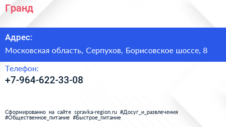 Гранд по адресу Московская область, Серпухов, Борисовское шоссе, 8 в дальнейшем Организация, размещена в следующих категориях: