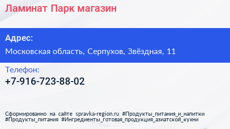 Ламинат Парк, магазин по адресу Московская область, Серпухов, Звёздная, 11 в дальнейшем Организация, размещена в следующих категориях: