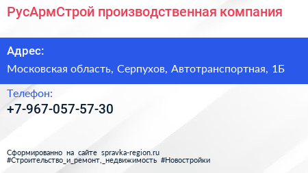 РусАрмСтрой, производственная компания по адресу Московская область, Серпухов, Автотранспортная, 1Б в дальнейшем Организация, размещена в следующих категориях: