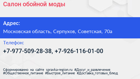 Салон обойной моды по адресу Московская область, Серпухов, Советская, 70а в дальнейшем Организация, размещена в следующих категориях:
