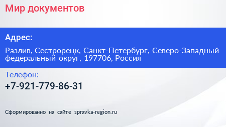 Мир документов по адресу Разлив, Сестрорецк, Санкт-Петербург, Северо-Западный федеральный округ, 197706, Россия в дальнейшем Организация, размещена в следующих категориях: