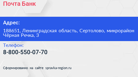 Почта Банк по адресу 188651, Ленинградская область, Сертолово, микрорайон Чёрная Речка, 3 в дальнейшем Организация, размещена в следующих категориях: