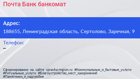Почта Банк, банкомат по адресу 188655, Ленинградская область, Сертолово, Заречная, 9 в дальнейшем Организация, размещена в следующих категориях: