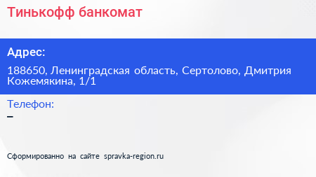 Тинькофф, банкомат по адресу 188650, Ленинградская область, Сертолово, Дмитрия Кожемякина, 1/1 в дальнейшем Организация, размещена в следующих категориях:
