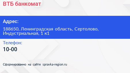 ВТБ, банкомат по адресу 188650, Ленинградская область, Сертолово, Индустриальная, 1 к1 в дальнейшем Организация, размещена в следующих категориях: