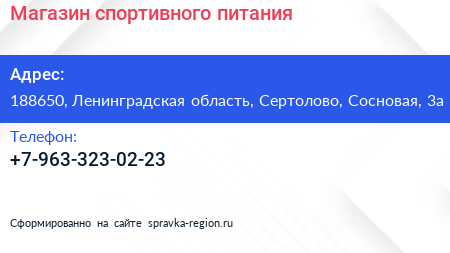 Магазин спортивного питания по адресу 188650, Ленинградская область, Сертолово, Сосновая, 3а в дальнейшем Организация, размещена в следующих категориях: