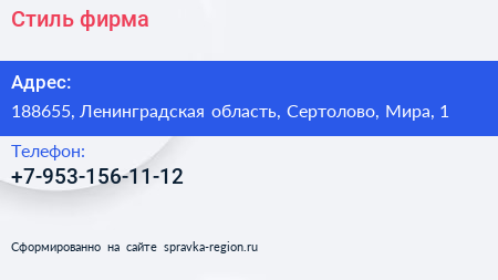 Стиль, фирма по адресу 188655, Ленинградская область, Сертолово, Мира, 1 в дальнейшем Организация, размещена в следующих категориях: