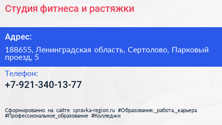 Студия фитнеса и растяжки по адресу 188655, Ленинградская область, Сертолово, Парковый проезд, 5 в дальнейшем Организация, размещена в следующих категориях: