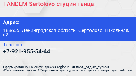 TANDEM Sertolovo, студия танца по адресу 188655, Ленинградская область, Сертолово, Школьная, 1 к2 в дальнейшем Организация, размещена в следующих категориях: