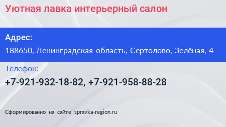 Уютная лавка, интерьерный салон по адресу 188650, Ленинградская область, Сертолово, Зелёная, 4 в дальнейшем Организация, размещена в следующих категориях: