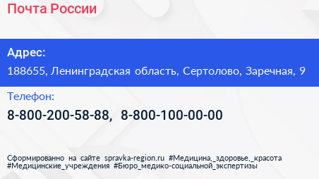 Почта России по адресу 188655, Ленинградская область, Сертолово, Заречная, 9 в дальнейшем Организация, размещена в следующих категориях: