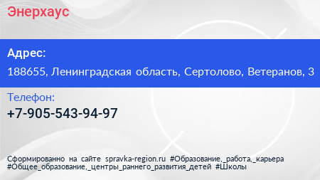 Энерхаус по адресу 188655, Ленинградская область, Сертолово, Ветеранов, 3 в дальнейшем Организация, размещена в следующих категориях: