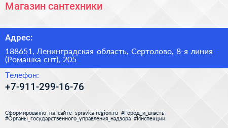 Магазин сантехники по адресу 188651, Ленинградская область, Сертолово, 8-я линия (Ромашка снт), 205 в дальнейшем Организация, размещена в следующих категориях: