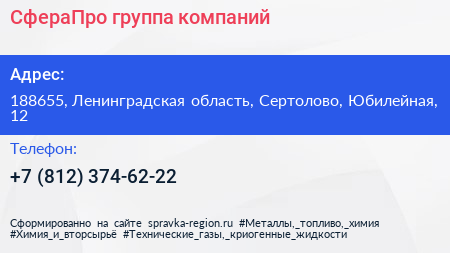 СфераПро, группа компаний по адресу 188655, Ленинградская область, Сертолово, Юбилейная, 12 в дальнейшем Организация, размещена в следующих категориях: