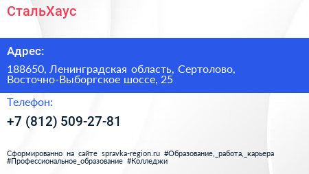 СтальХаус по адресу 188650, Ленинградская область, Сертолово, Восточно-Выборгское шоссе, 25 в дальнейшем Организация, размещена в следующих категориях: