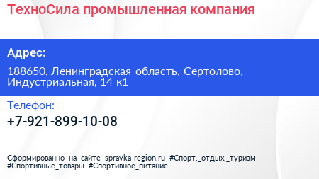 ТехноСила, промышленная компания по адресу 188650, Ленинградская область, Сертолово, Индустриальная, 14 к1 в дальнейшем Организация, размещена в следующих категориях: