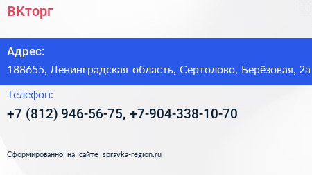 ВКторг по адресу 188655, Ленинградская область, Сертолово, Берёзовая, 2а в дальнейшем Организация, размещена в следующих категориях: