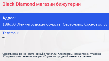 Black Diamond, магазин бижутерии по адресу 188650, Ленинградская область, Сертолово, Сосновая, 3а в дальнейшем Организация, размещена в следующих категориях:
