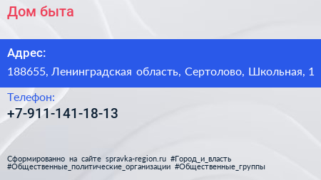 Дом быта по адресу 188655, Ленинградская область, Сертолово, Школьная, 1 в дальнейшем Организация, размещена в следующих категориях: