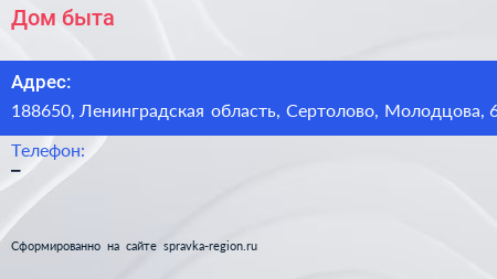 Дом быта по адресу 188650, Ленинградская область, Сертолово, Молодцова, 6 в дальнейшем Организация, размещена в следующих категориях: