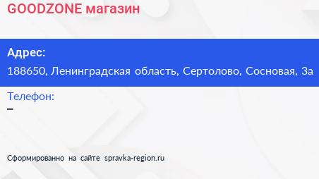 GOODZONE, магазин по адресу 188650, Ленинградская область, Сертолово, Сосновая, 3а в дальнейшем Организация, размещена в следующих категориях: