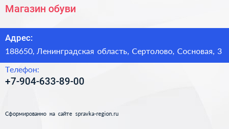 Магазин обуви по адресу 188650, Ленинградская область, Сертолово, Сосновая, 3 в дальнейшем Организация, размещена в следующих категориях: