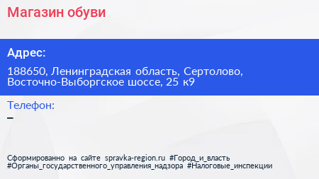 Магазин обуви по адресу 188650, Ленинградская область, Сертолово, Восточно-Выборгское шоссе, 25 к9 в дальнейшем Организация, размещена в следующих категориях: