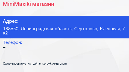 MiniMaxiki, магазин по адресу 188650, Ленинградская область, Сертолово, Кленовая, 7 к2 в дальнейшем Организация, размещена в следующих категориях:
