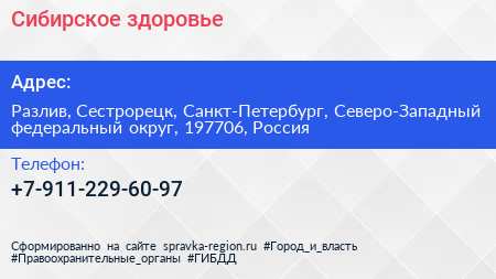 Сибирское здоровье по адресу Разлив, Сестрорецк, Санкт-Петербург, Северо-Западный федеральный округ, 197706, Россия в дальнейшем Организация, размещена в следующих категориях: