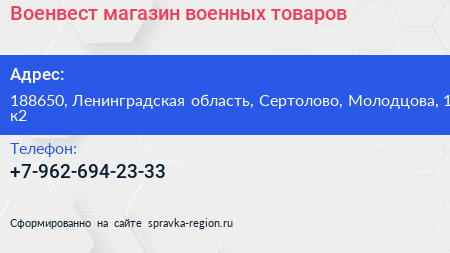 Военвест, магазин военных товаров по адресу 188650, Ленинградская область, Сертолово, Молодцова, 1 к2 в дальнейшем Организация, размещена в следующих категориях: