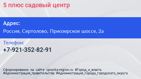 5 плюс, садовый центр по адресу 2, Приозерское шоссе, Дранишники, Юкковское сельское поселение, Всеволожский район, Ленинградская область, Северо-Западный федеральный округ, 188650, Россия в дальнейшем Организация, размещена в следующих категориях: