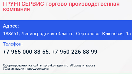 ГРУНТСЕРВИС, торгово-производственная компания по адресу 188651, Ленинградская область, Сертолово, Ключевая, 1а в дальнейшем Организация, размещена в следующих категориях: