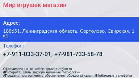 Мир игрушек, магазин по адресу 188651, Ленинградская область, Сертолово, Свирская, 1 к1 в дальнейшем Организация, размещена в следующих категориях: