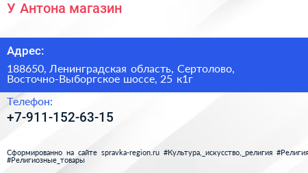 У Антона, магазин по адресу 188650, Ленинградская область, Сертолово, Восточно-Выборгское шоссе, 25 к1г в дальнейшем Организация, размещена в следующих категориях: