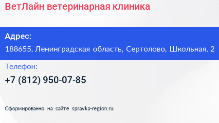 ВетЛайн, ветеринарная клиника по адресу 188655, Ленинградская область, Сертолово, Школьная, 2 в дальнейшем Организация, размещена в следующих категориях: