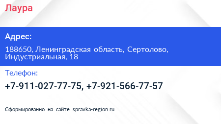 Лаура по адресу 188650, Ленинградская область, Сертолово, Индустриальная, 18 в дальнейшем Организация, размещена в следующих категориях: