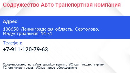 Содружество-Авто, транспортная компания по адресу 188650, Ленинградская область, Сертолово, Индустриальная, 14 к1 в дальнейшем Организация, размещена в следующих категориях: