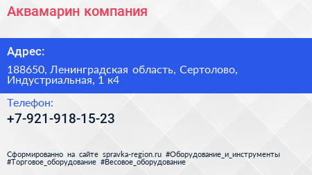 Аквамарин, компания по адресу 188650, Ленинградская область, Сертолово, Индустриальная, 1 к4 в дальнейшем Организация, размещена в следующих категориях: