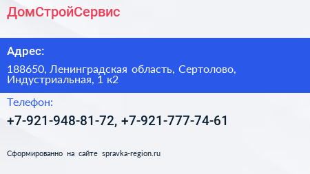 ДомСтройСервис по адресу 188650, Ленинградская область, Сертолово, Индустриальная, 1 к2 в дальнейшем Организация, размещена в следующих категориях: