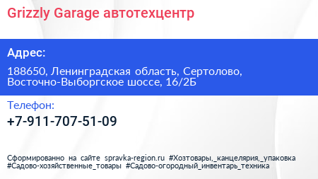 Grizzly Garage, автотехцентр по адресу 188650, Ленинградская область, Сертолово, Восточно-Выборгское шоссе, 16/2Б в дальнейшем Организация, размещена в следующих категориях: