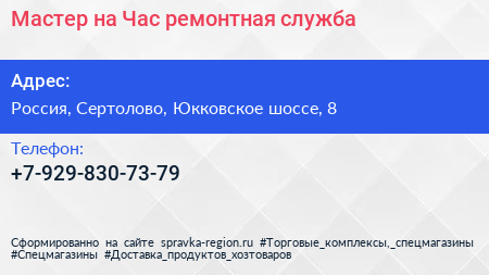 Мастер на Час, ремонтная служба по адресу 8, Юкковское шоссе, Осиновая Роща, Парголово, Юкковское сельское поселение, Всеволожский район, Санкт-Петербург, Северо-Западный федеральный округ, 194362, Россия в дальнейшем Организация, размещена в следующих категориях: