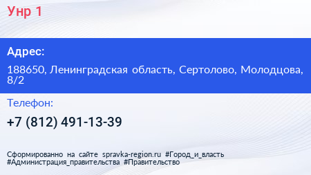 Унр-1 по адресу 188650, Ленинградская область, Сертолово, Молодцова, 8/2 в дальнейшем Организация, размещена в следующих категориях:
