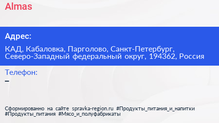 Almas по адресу КАД, Кабаловка, Парголово, Санкт-Петербург, Северо-Западный федеральный округ, 194362, Россия в дальнейшем Организация, размещена в следующих категориях: