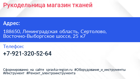 Рукодельница, магазин тканей по адресу 188650, Ленинградская область, Сертолово, Восточно-Выборгское шоссе, 25 к7 в дальнейшем Организация, размещена в следующих категориях: