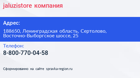 jaluzistore, компания по адресу 188650, Ленинградская область, Сертолово, Восточно-Выборгское шоссе, 25 в дальнейшем Организация, размещена в следующих категориях: