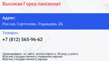 Высокая Горка, пансионат по адресу Высокая Горка, 2Б, улица Радищева, Юкки, Юкковское сельское поселение, Всеволожский район, Ленинградская область, Северо-Западный федеральный округ, 188652, Россия в дальнейшем Организация, размещена в следующих категориях: